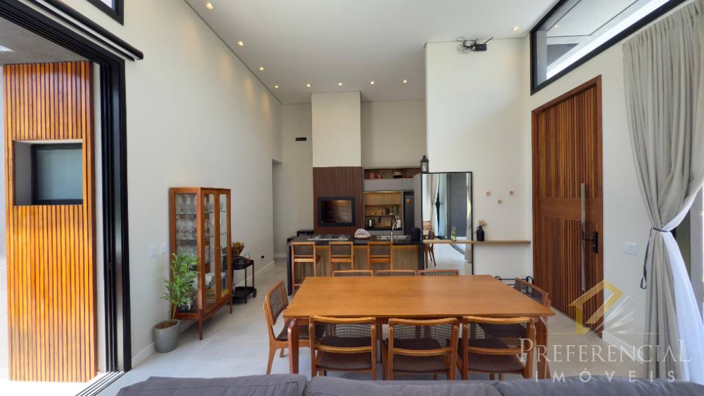 Living integrado de Cozinha americana com churrasqueira sala de estar com lareira e sala de jantar.