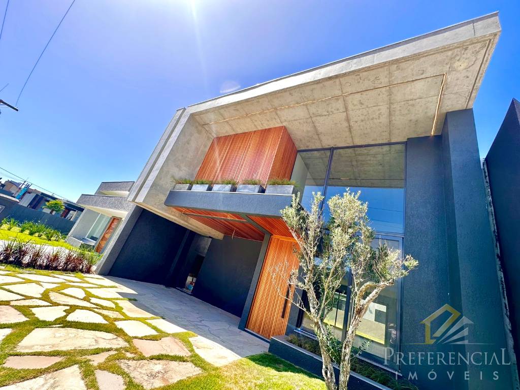 Belíssimo sobrado com detalhes minimalistas em madeira e concreto aparente, fachada imponente e sofisticada, ótima localização dentro do condomínio.