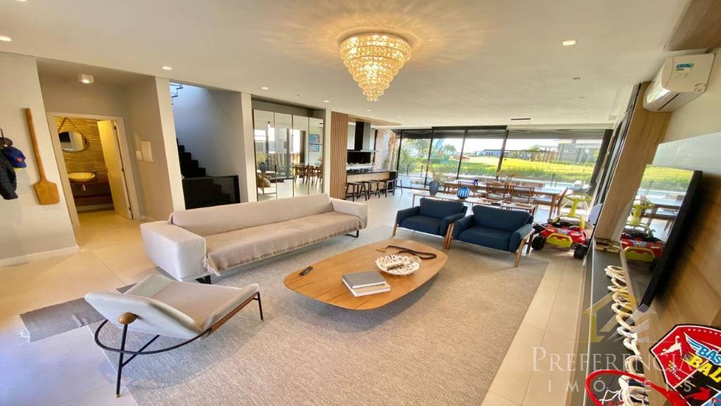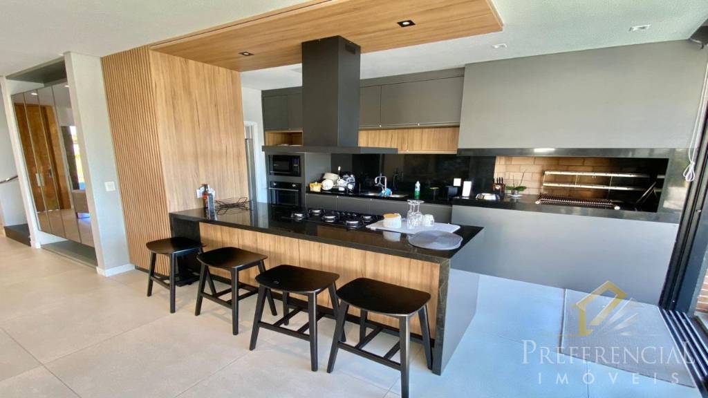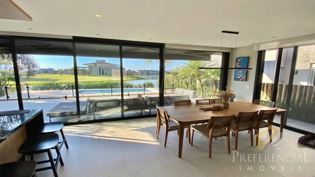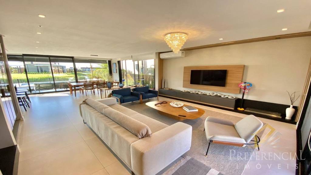 O encontro da beleza e da tranquilidade em um imóvel com traços modernos que unem concreto aparente e madeira. Mobiliado, decorado, com 4 suítes sendo uma térrea e lavabo. O amplo living com lareira integra os ambientes de estar, jantar e cozinha equipada com churrasqueira, o pátio privativo nos brinda com um aconchegante espaço de contemplação com vista exuberante para piscina e lago.